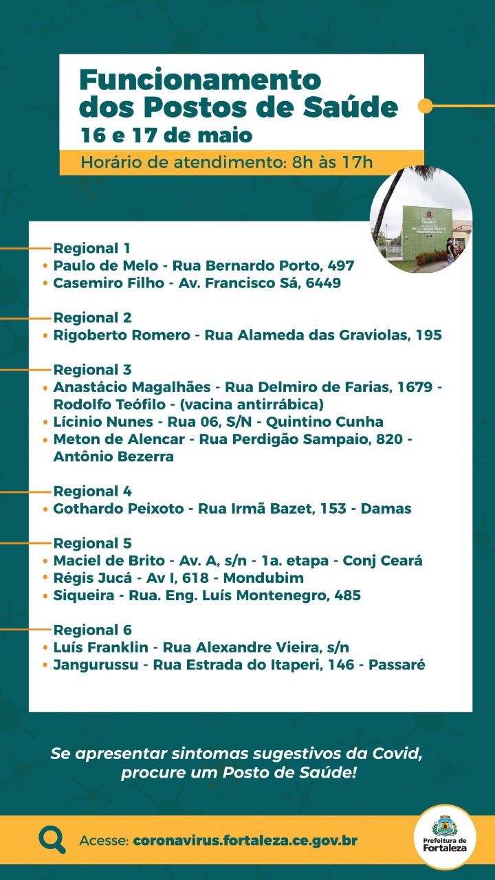 Neste fim de semana (16 e 17/05), a Prefeitura de Fortaleza segue prestando serviços de acolhimento para os pacientes com sintomas da Covid-19, com o funcionamento de 12 Postos de Saúde. O atendimento acontecerá das 8h às 17h e terá como prioridade pessoas com quadros de síndromes gripais.