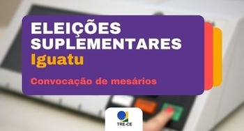 Banner retangular com a fotografia embaçada de uma urna eletrônica ao fundo. À esquerda, ao centro do banner, sobre um retângulo roxo, em caixa alta, com letras brancas, o título: eleições suplementares. Mais abaixo, em amarelo, a palavra: Iguatu. Na sequência, em vermelho: Convocação de mesários. Na parte inferior do banner, ao centro, sobre uma tarja branca, a logo do TRE-CE.