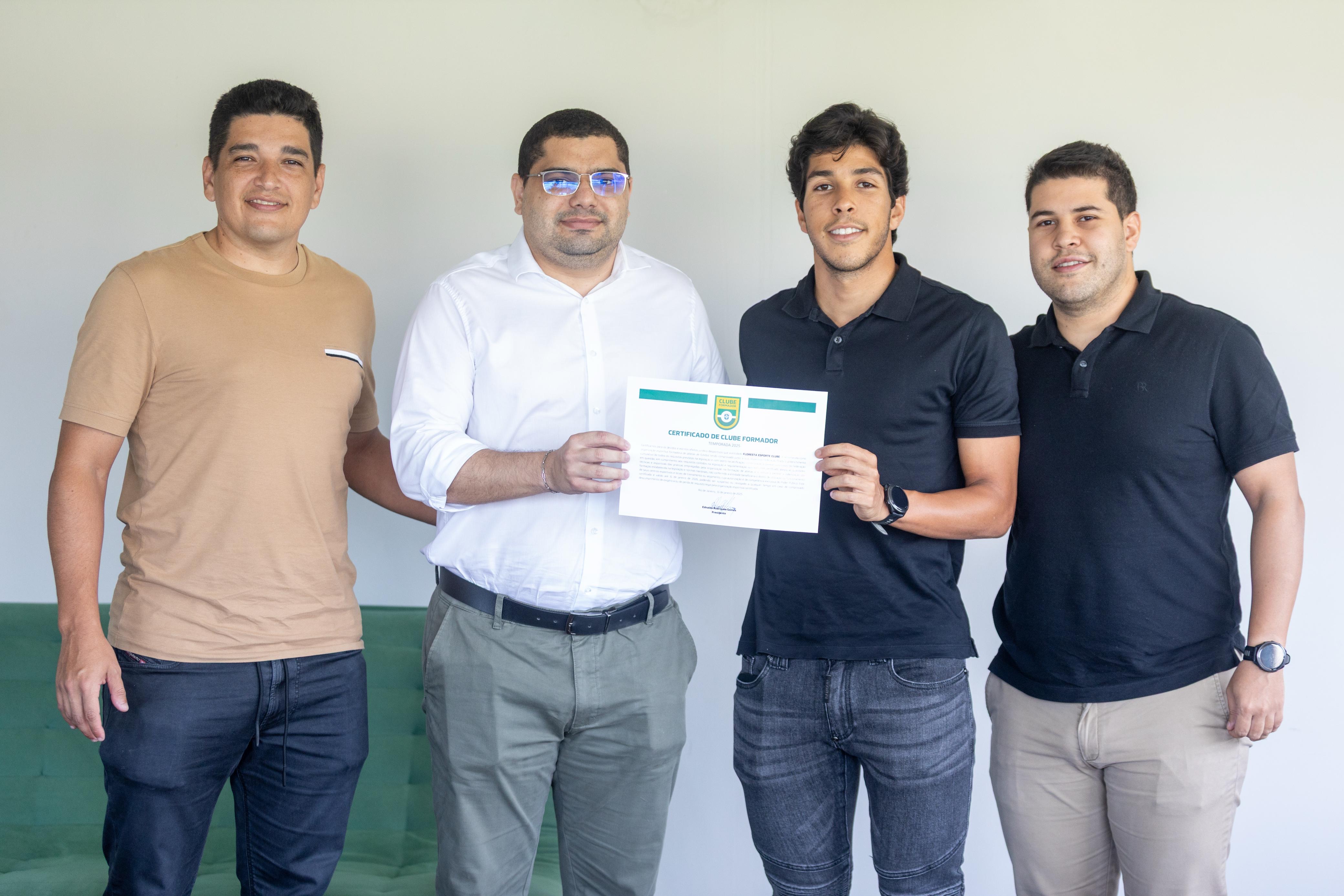 O vice-presidente da Federação Cearense de Futebol, Mauro Carmélio Neto, entregou, nesta sexta-feira (25), o Certificado de Clube Formador ao Floresta Esporte Clube. O documento, emitido pela Confederação Brasileira de Futebol (CBF), tem validade até 31 de janeiro de 2026 e reconhece oficialmente a capacidade do clube em formar jovens atletas conforme os critérios estabelecidos pela legislação esportiva nacional. Participaram do encontro o vice-presidente do clube, Diego Felício, acompanhado dos irmãos Christian e Matheus. Também estiveram presentes o Assessor da Presidência da FCF, Luzinho Torquato e o Diretor de Marketing, Biriba do Vale.