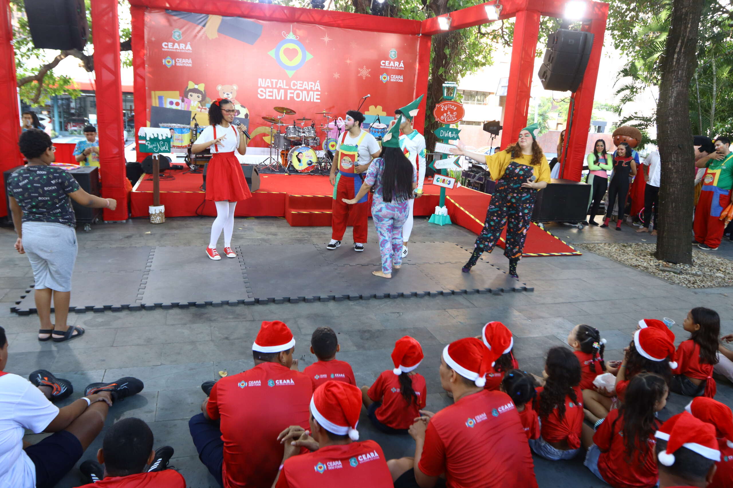 O espírito natalino tomou conta do Palácio da Abolição, nesta sexta-feira (19). O Governo do Ceará realizou o Natal Ceará Sem Fome, ocasião em que o governador Elmano de Freitas e a primeira-dama e presidente do Comitê Intersetorial de Governança do Programa Ceará Sem Fome, Lia de Freitas, recepcionaram 500 crianças beneficiadas pelo programa e tuteladas pela Secretaria da Proteção Social.