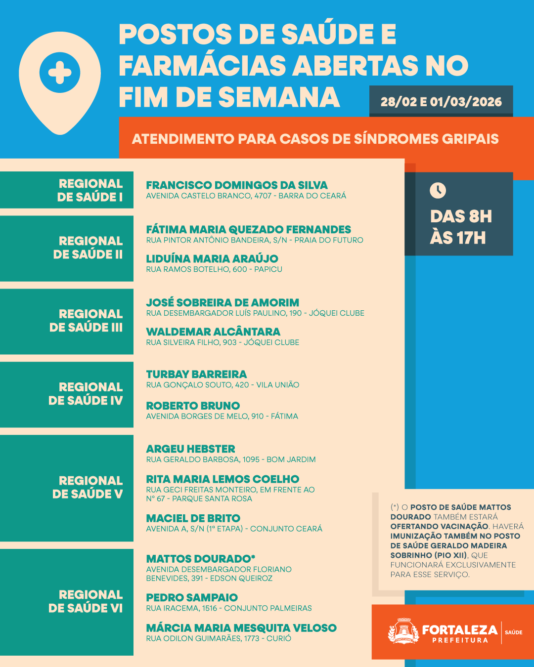 A Prefeitura de Fortaleza irá abrir 13 postos de saúde neste fim de semana (28/02 e 1º/03) para ampliar o atendimento à população durante o período de maior circulação de síndromes respiratórias. As unidades funcionarão das 8h às 17h. As farmácias dos postos também estarão abertas no mesmo horário para entrega de medicamentos.