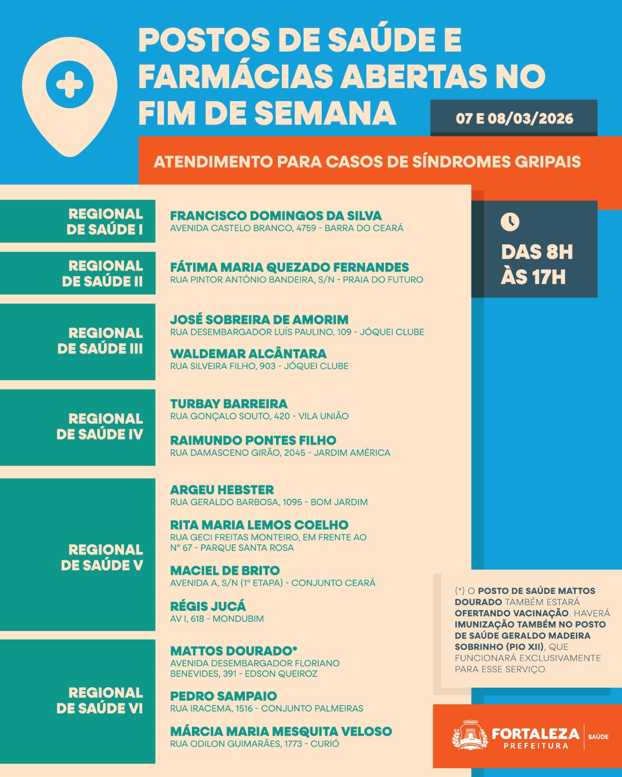 A Prefeitura de Fortaleza abre 13 postos de saúde neste fim de semana (07 e 08/3), das 8h às 17h, para ampliar o atendimento à população durante o período de maior circulação de doenças respiratórias. A farmácia das unidades também estarão em funcionamento para entrega de medicamentos.