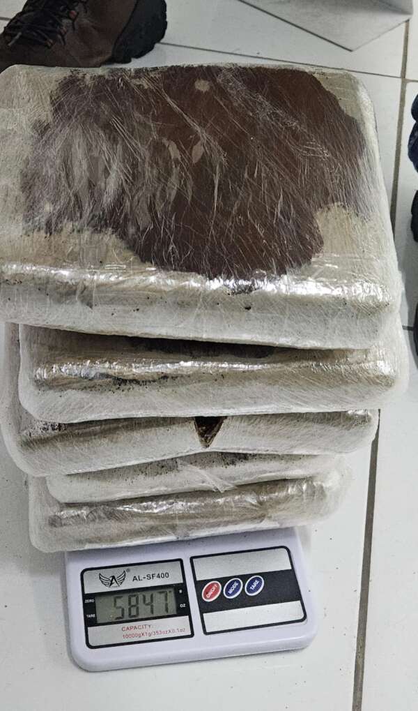 Com as informações sobre a possível prática criminosa, os investigadores da Denarc identificaram um material ilícito que estaria dentro de um ônibus de viagens oriundo do Rio de Janeiro com destino à Reriutaba. Na BR 020, em Tauá, o veículo foi interceptado. Durante a inspeção, uma mala com drogas foi identificada com apoio do cão policial Faruk. Dentro da bagagem, os agentes encontraram 5,847 quilos de uma substância análoga à maconha.