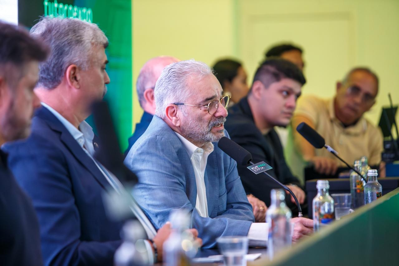 A Arena Castelão recebeu nesta quarta-feira (22), a coletiva de lançamento da primeira edição da FutPro Expo 2026, que acontece no Centro de Eventos entre os dias 7 e 9 de maio. O presidente da Federação Cearense de Futebol, Mauro Carmélio, foi um dos convidados para compor a mesa de apresentação, ao lado de autoridades do Governo do Estado, representado pelo secretário de Esporte, Rogério Pinheiro; da Prefeitura de Fortaleza, representada pelo chefe de gabinete, Eudes Bringel, que também é vice-presidente da FCF, e pelo secretário de Esportes e Lazer, Anderson Pinheiro; além dos presidentes de Ceará, Ferroviário e Fortaleza, e dos idealizadores do evento.