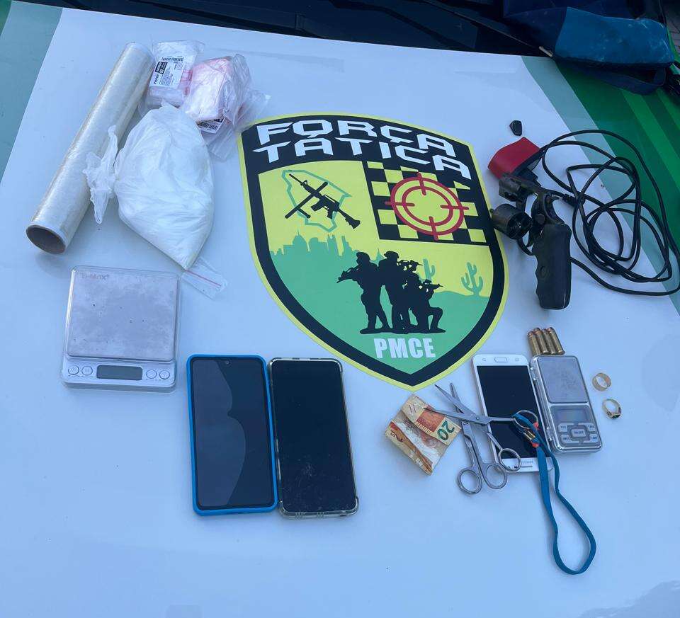 Ao notar a chegada dos policiais, o suspeito tentou fugir pulando muros e invadindo residências vizinhas, mas foi capturado após uma busca minuciosa na região. Com ele, os militares encontraram uma mochila contendo um revólver calibre .38 com nove munições, 295 gramas de cocaína, duas balanças de precisão e materiais para embalagem de drogas. Além dos ilícitos, foram recuperados os pertences das vítimas — um anel de formatura e uma aliança.