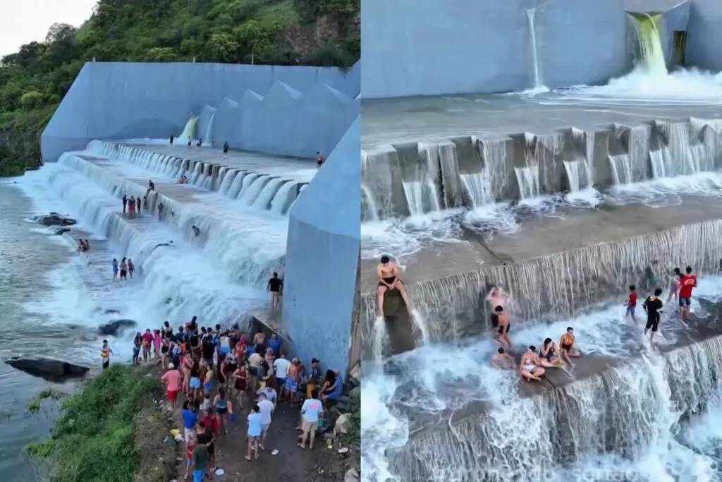 Foto: Reprodução Um vídeo que circula nas redes sociais mostra jovens escalando o sangradouro do Açude Orós, no interior do Ceará, mesmo com o aumento do volume de água após o reservatório voltar a sangrar na última quarta-feira (15). As imagens foram registradas na sexta-feira (17) e revelam pessoas sobre a estrutura e próximas à queda d’água. A situação é considerada de risco devido à força da correnteza. O açude é o segundo maior do Estado e atingiu novamente sua capacidade máxima. Gcmais